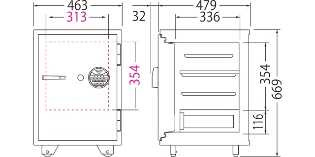 外寸:幅463×奥行511×高さ669mm 内寸:幅325×奥行336×高さ470mm