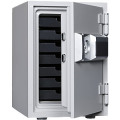 家庭用耐火金庫のMEKシリーズ。 MEKシリーズはプッシュタイプになります。 暗証番号を入力し、キーを差し込み廻すだけの簡単なシステムです。暗証番号は4~16桁で入力できます。万一のトラブル、暗証番号の忘れなど、非常時開錠キー付きです。